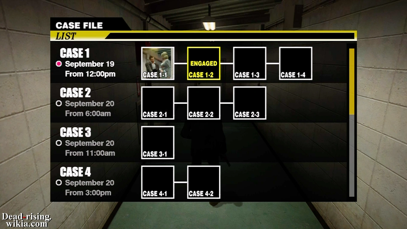 Cases are the series of events that lead Frank West to the truth behind the zombie outbreak in Willamette. When Frank finds out about a Case, the Case File Screen appears. The Case Panels inside the Case File Screen list important information, such as if the case is pending or engaged, if it's been solved, or if it's expired. You can access the Case File Screen at any time by pressing