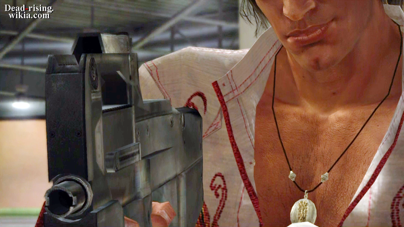 When Carlito retreats to the roof, Frank can jump up onto the entrance arch of Chris' Fine Foods to pick up a sub-machine gun, but Frank will be open to attack from Carlito while Frank is exposed.