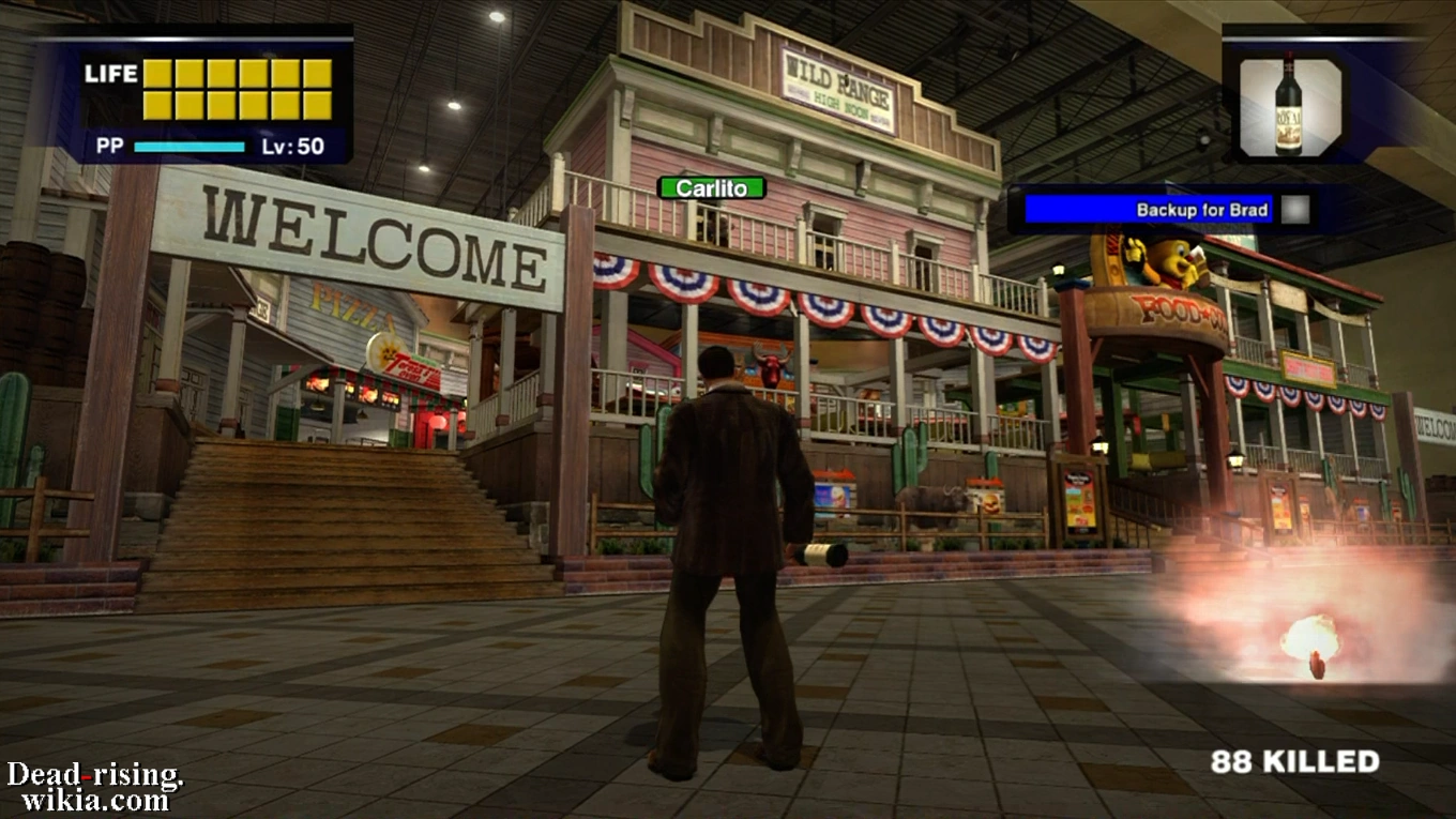 Use the food court restaurants and pillars as cover, using the hand gun or sub-machine gun (see #Machine Gun above), to chip Carlito's health down while eating the food and drinks in the Food Court. After Carlito's health drops a bit, he will retreat from the gantry at the front of the Wild West section to the roofs of the restaurants in the back of the plaza.