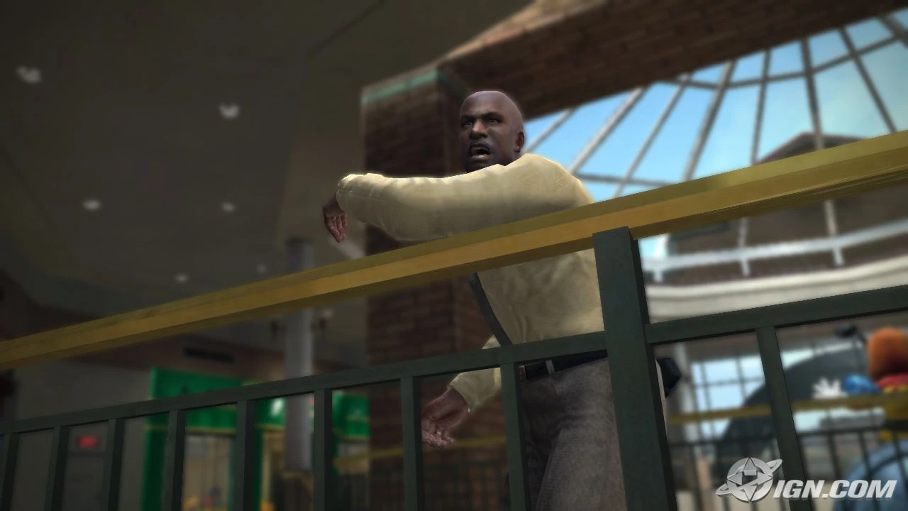 Before Frank picks anything up for the barricade, an old man on the other side of a shutter yells at Frank, but Frank doesn't have any time to respond as the crazy old woman opens the main doors to get to her dog, letting the zombies into the mall. A man shows up on the floor above and orders everyone to run and follow him to safety.